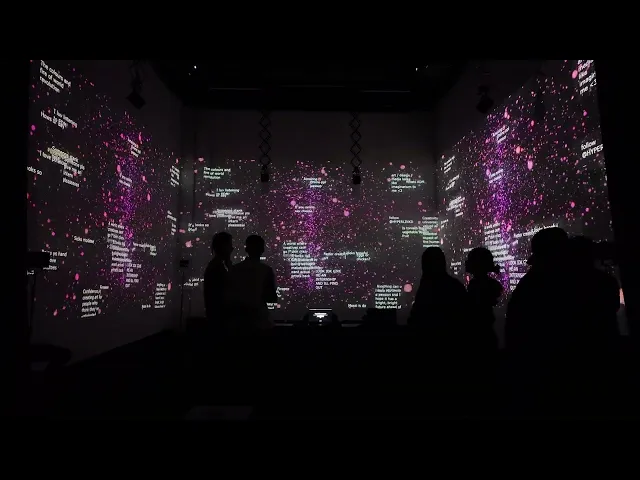 To maximize immersion, we designed the physical setup as a three-sided projection space combined with ambient music. Three large screens surrounded participants on the front and sides, allowing the shifting visuals—bright or dim, natural or abstract—to envelop them from multiple angles. The spatial arrangement was carefully considered: seating and standing zones were blended to create both accessibility and openness, ensuring participants felt comfortable while remaining engaged. Sound played an equally crucial role; multi-directional speakers projected adaptive soundscapes that matched the sentiment-driven visuals, from hopeful melodies to somber tones. This interplay of spatial enclosure, dynamic projection, and responsive audio crafted an environment where participants were not just observers, but active contributors immersed in a collective narrative.